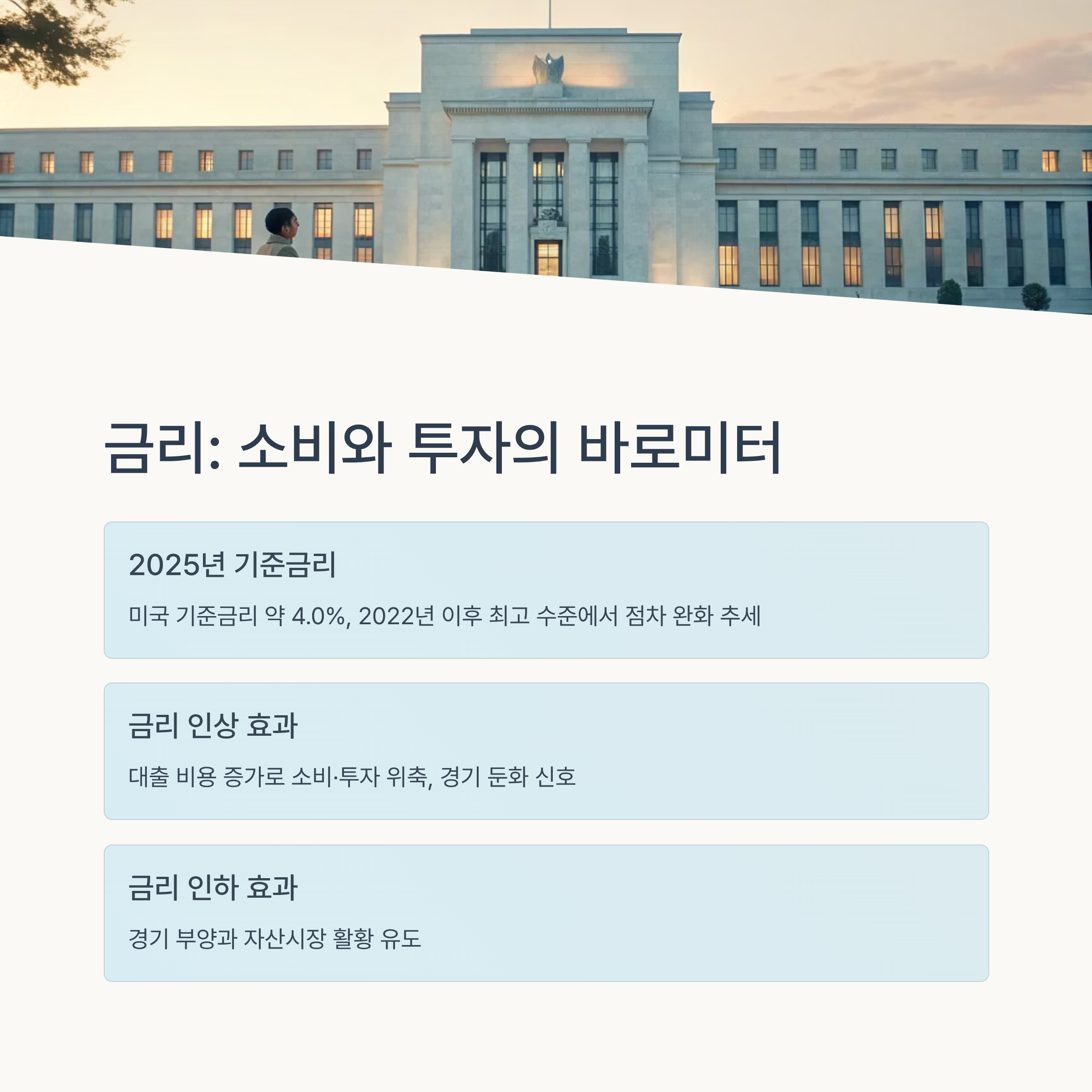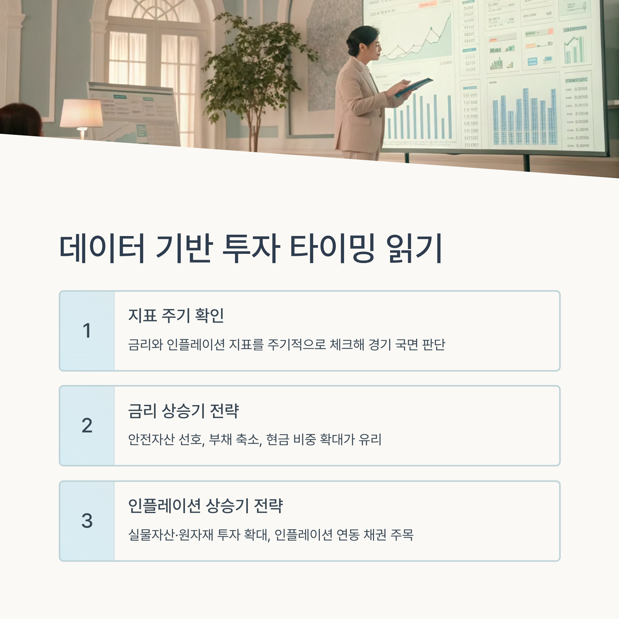 | 금리 인상 시 채권·예금 비중 ↑ | 생활비 상승 대비 현금흐름 점검 | 금리 흐름 → 투자 시나리오 설계 |