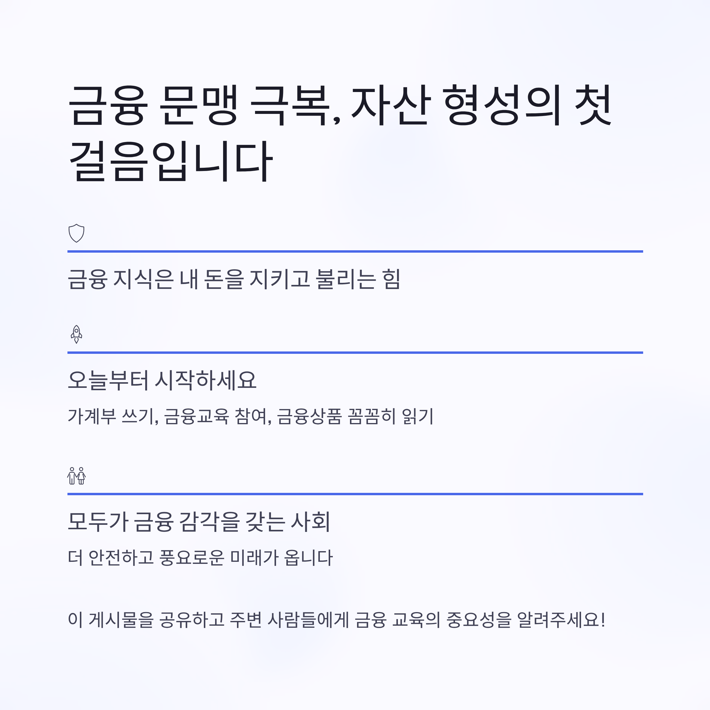 금융 문맹은 더 이상 방치할 수 없는 리스크입니다. 누구나 처음은 어렵지만, 하나하나 용어를 이해하고 돈의 구조를 파악하는 순간부터 재무적 자유로 향하는 문이 열립니다. 금융 지식은 당신을 지키는 가장 강력한 무기입니다.
