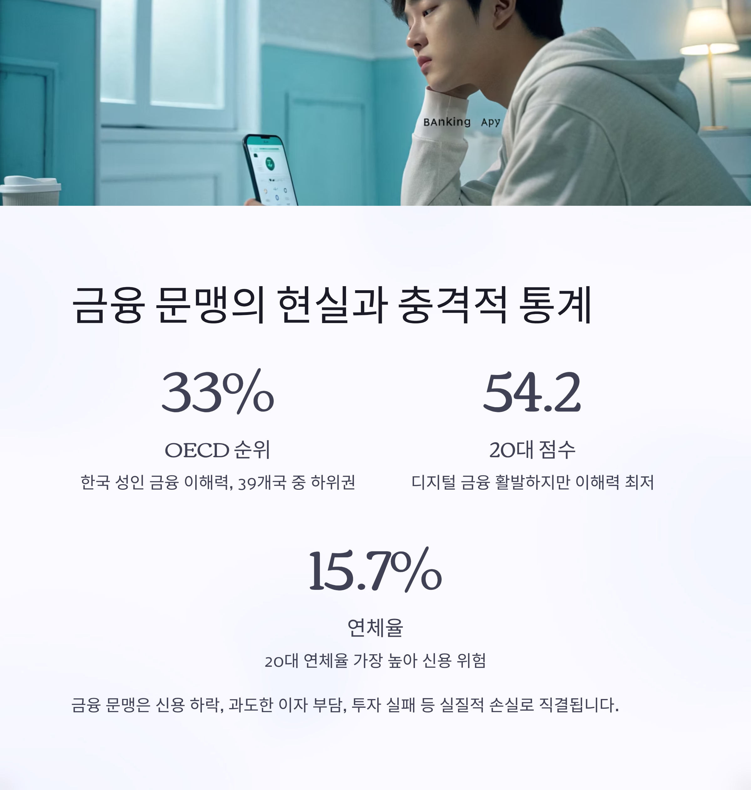 | 금융 문맹의 예시 | 예금과 적금 차이 모름 / 신용등급 영향 요소 파악 못함 / 세금 환급 구조 미이해 |