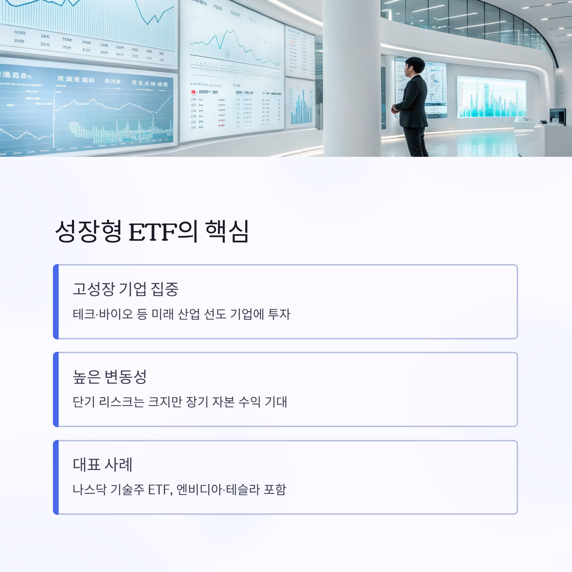 | 성장형 ETF 특징 | 테크, 바이오, 혁신 산업 중심 / 배당 거의 없음 / 수익 변동성 큼 |