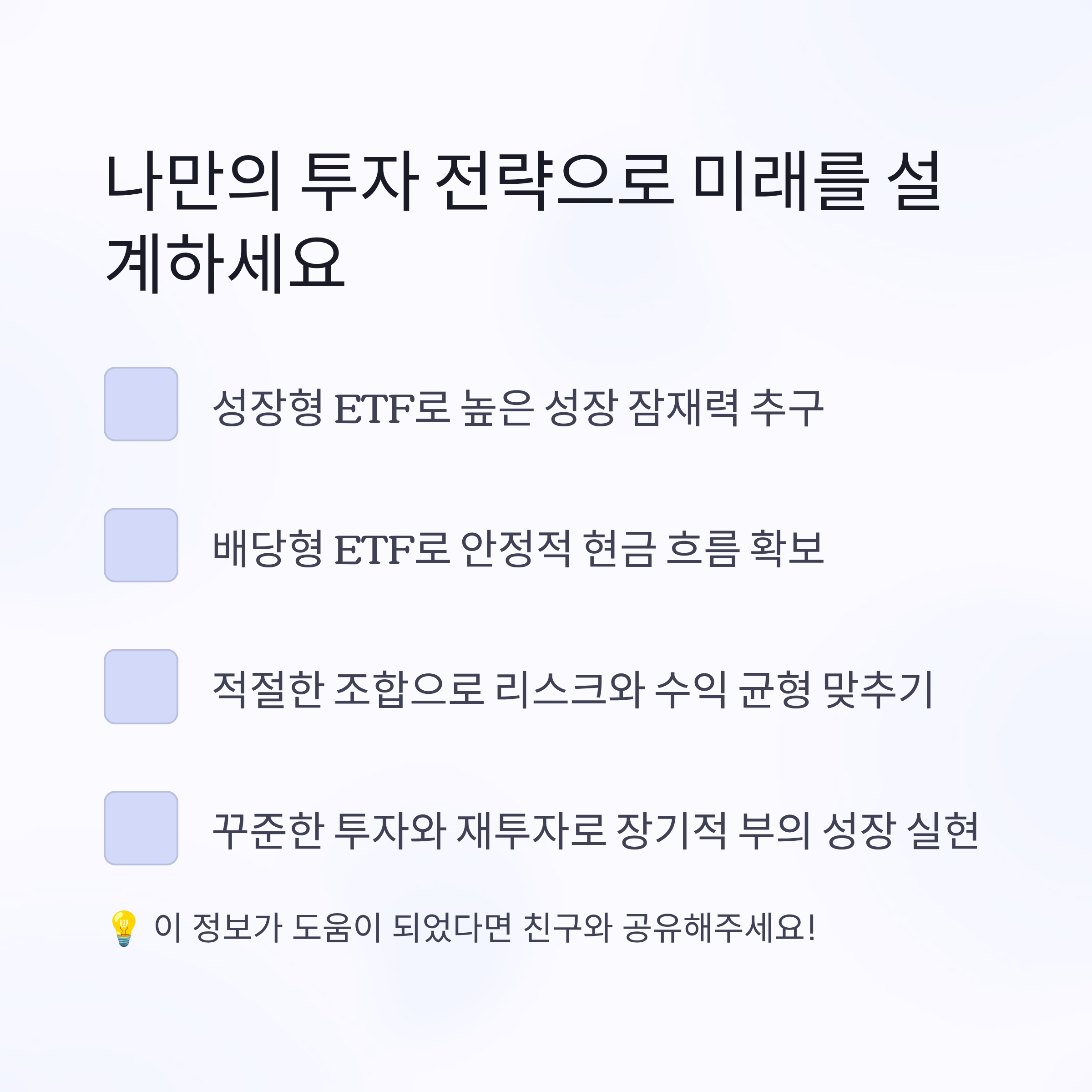 투자 성향에 따라 둘 중 하나만 선택할 필요는 없습니다. 자산의 일부는 성장형 ETF로 장기 성장 기회를 노리고, 나머지는 배당형 ETF로 현금흐름과 방어력을 확보하는 혼합 포트폴리오 전략이 유효합니다. 특히 금리나 시장 분위기에 따라 비중을 조절하는 리밸런싱을 병행하면 더욱 효과적입니다.