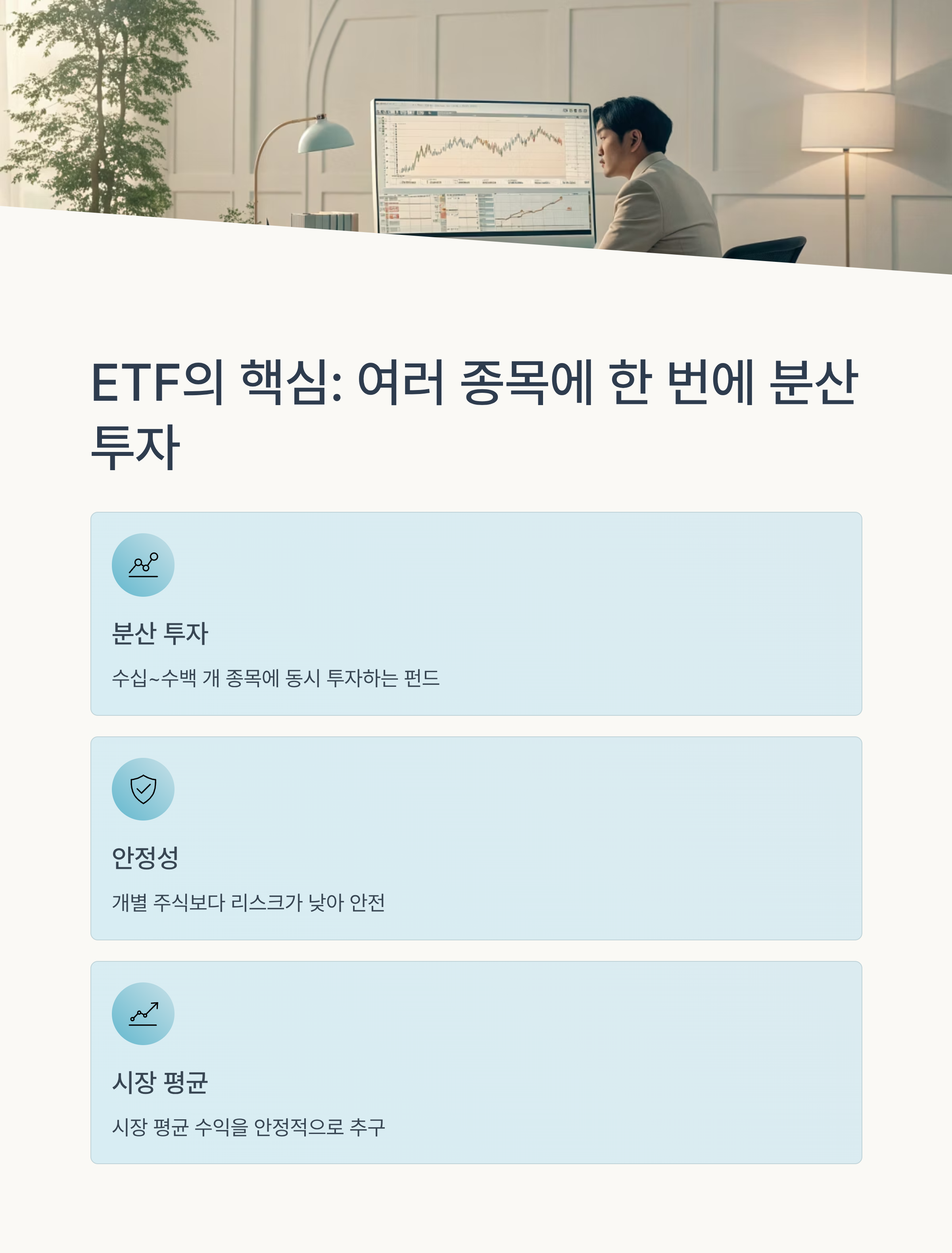 ETF의 가장 큰 장점은 분산 투자입니다. 개별 종목보다 리스크가 적고, 다양한 산업에 동시에 투자할 수 있죠. 예를 들어 '코스피200 ETF'는 국내 주요 대형주 200종목에 자동으로 분산 투자되는 구조입니다. 변동성이 적고, 장기적으로 안정적인 수익을 기대할 수 있어 바쁜 직장인이나 초보 투자자에게 적합합니다. 또, 모바일 증권 앱에서 손쉽게 매매가 가능하다는 점도 ETF의 큰 장점입니다.