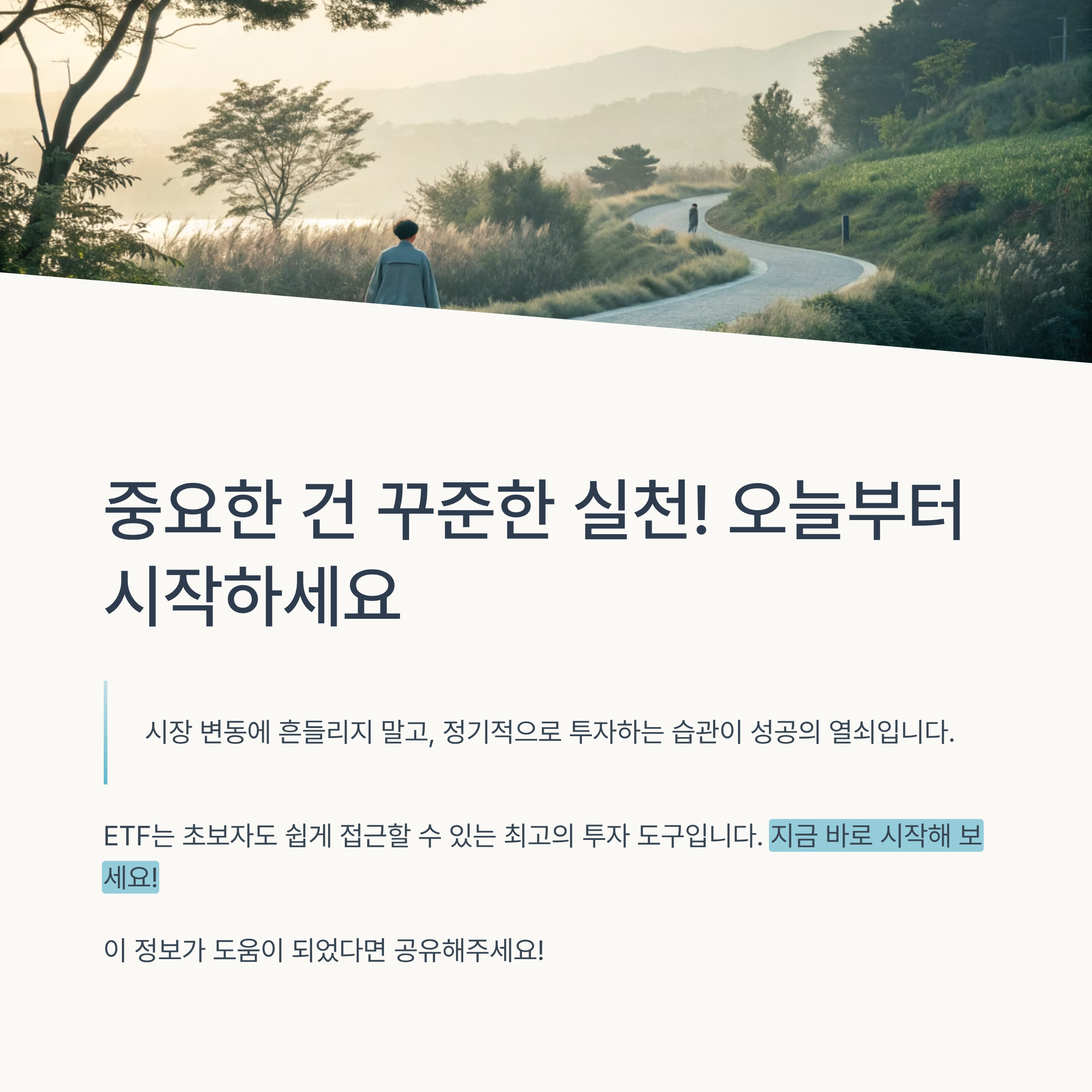투자는 단순히 돈을 불리는 수단이 아니라, 미래를 준비하는 하나의 태도입니다. ETF는 그중에서도 안정성과 효율성을 동시에 잡을 수 있는 훌륭한 도구이며, 특히 소액으로 시작하는 투자자에게 부담 없는 선택지가 됩니다. 1만 원, 5천 원으로도 투자할 수 있고, 다양한 종목에 분산해 리스크를 줄일 수 있는 장점은 초보 투자자에게 큰 무기가 됩니다. 중요한 것은 '얼마를 투자하느냐'보다 '어떻게 꾸준히 실천하느냐'입니다. 지금은 시작이 작더라도, 꾸준한 적립식 투자와 철저한 정보 수집이 쌓이면, 언젠가 분명 큰 결과를 만들어낼 수 있습니다. 아직 ETF가 어렵게 느껴진다면, 오늘 소개한 방법부터 차근차근 실천해보세요. 여러분의 첫 투자가 성공적인 시작이 될 수 있기를 응원합니다.