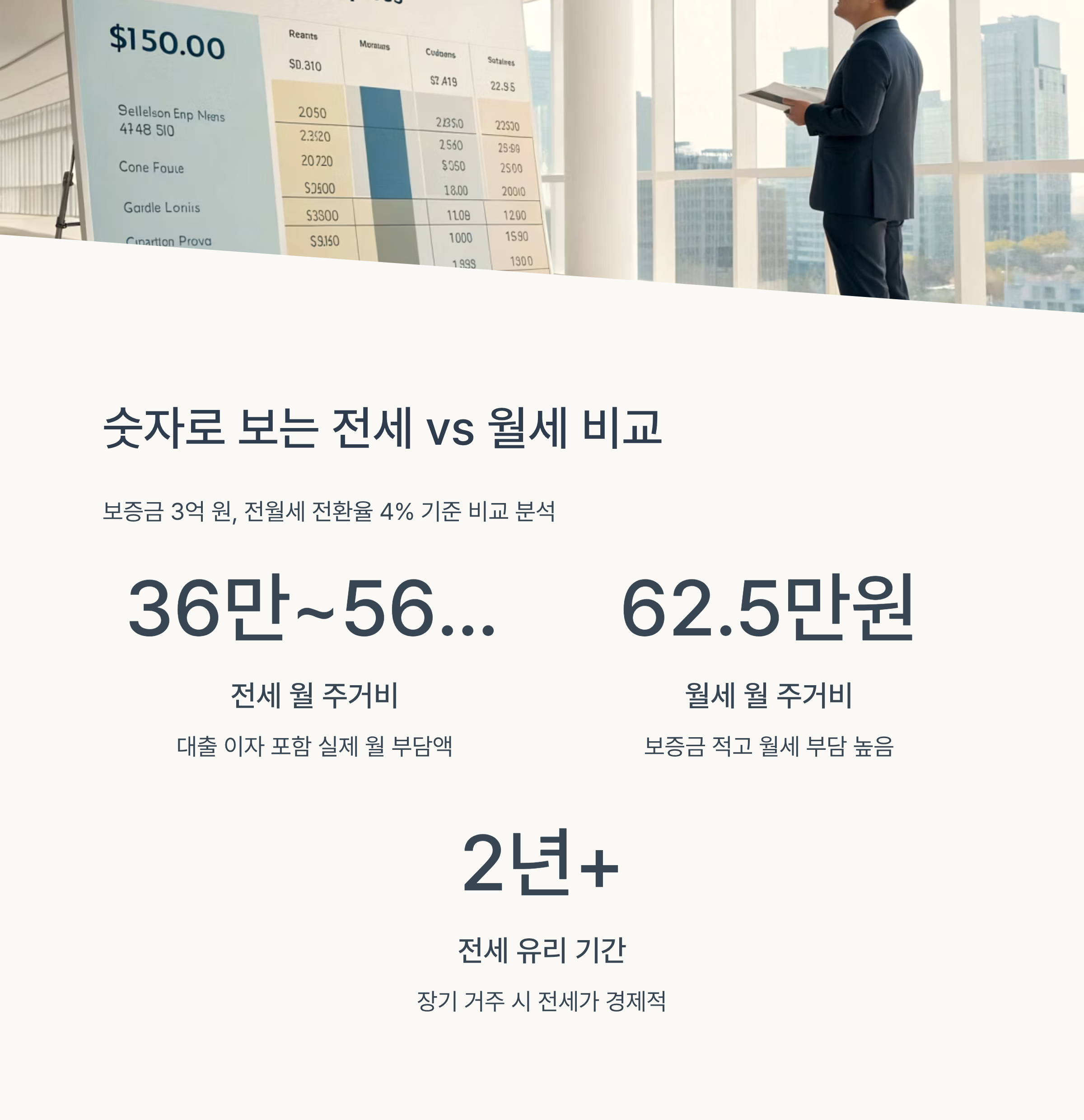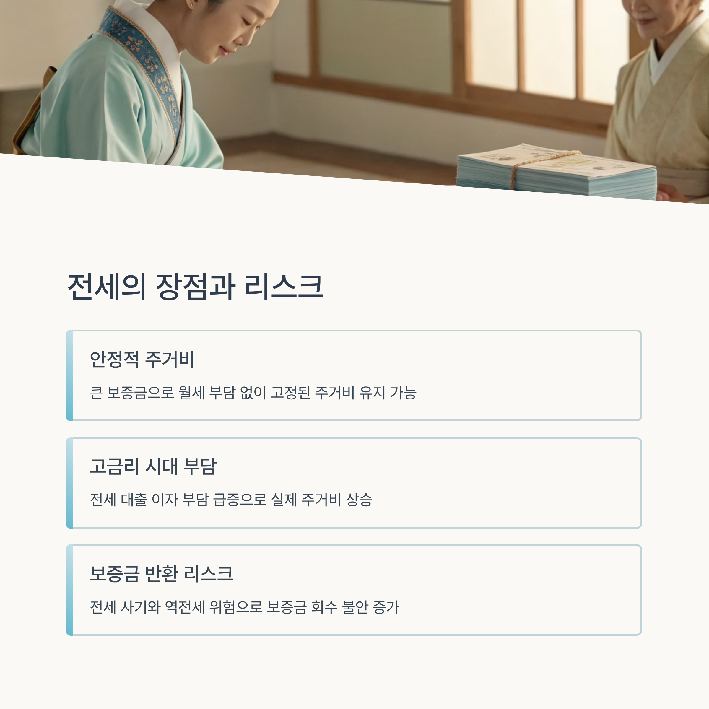 전세의 가장 큰 장점은 주거비가 고정되고, 보증금이 나중에 돌아온다는 안정성입니다. 또한 보증금을 통한 간접 투자 효과도 기대할 수 있죠. 하지만 요즘처럼 금리가 높은 상황에서는 전세 대출 이자 부담이 커지고, 일부 지역에선 전세가가 하락하며 보증금 손실 리스크도 존재합니다. 따라서 무조건 전세가 유리하다고 보긴 어렵습니다. 실제 연이율 기준으로 계산해봤을 때, 보증금 대비 월세가 낮고 대출 금리가 높다면 오히려 월세가 더 경제적인 선택일 수 있습니다.