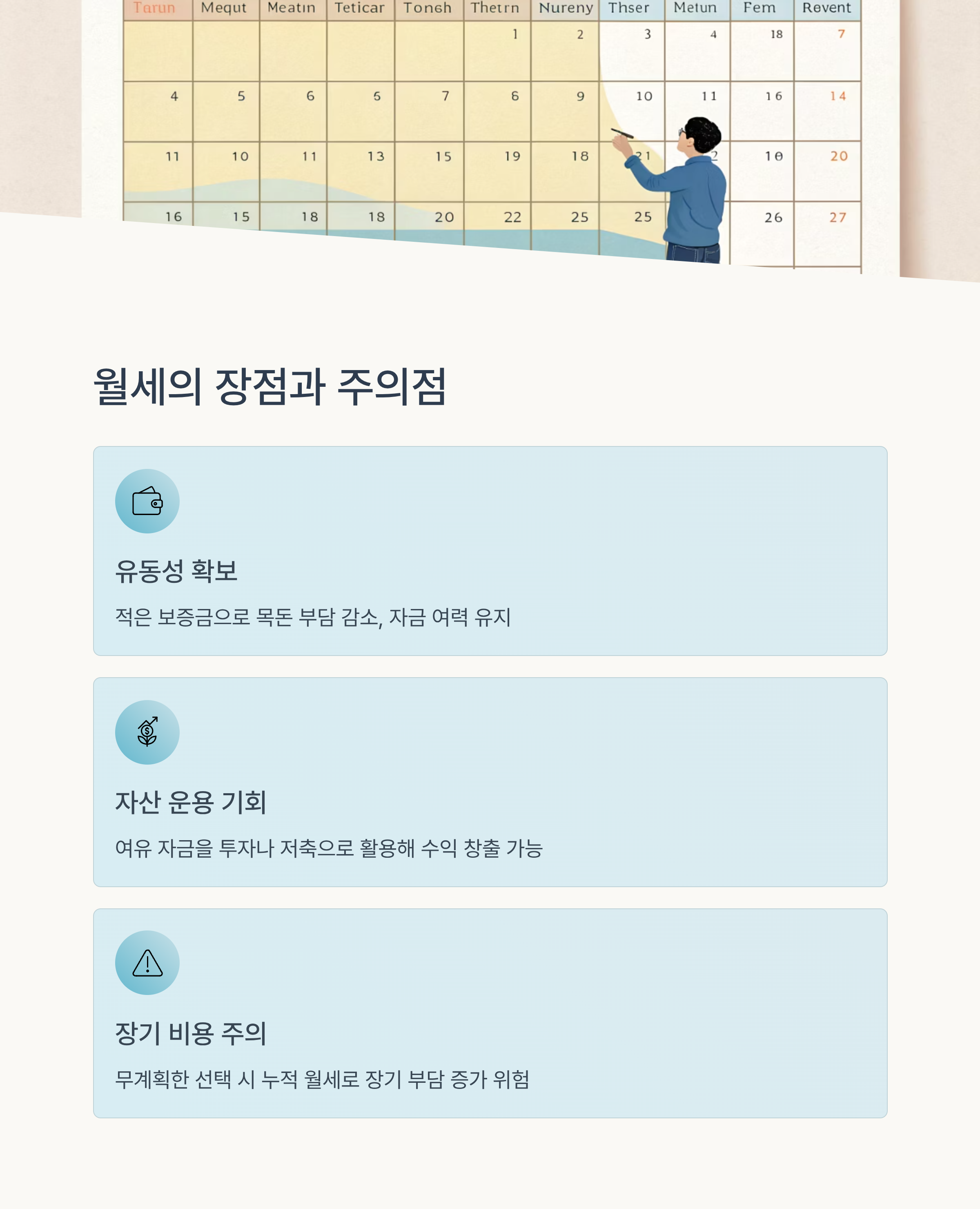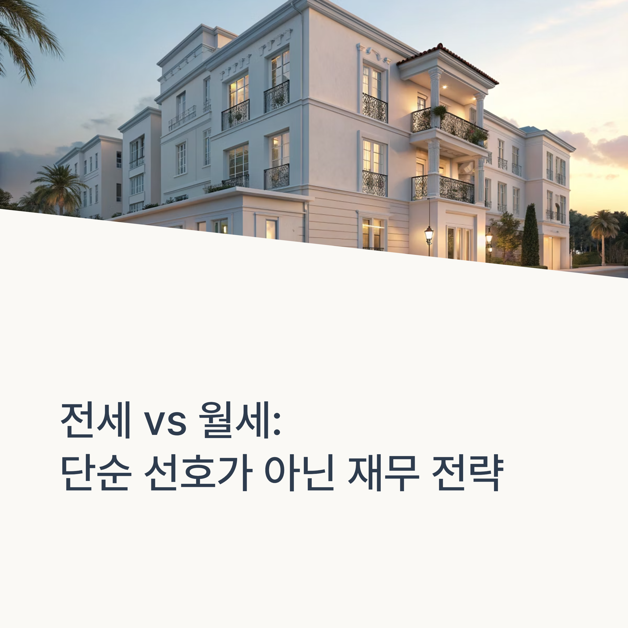 월세는 매달 지출이 발생하지만, 초기 자금이 적고 유동성이 높다는 장점이 있습니다. 특히 자산을 적극적으로 운용하는 투자자라면 전세 자금으로 운용 수익률이 월세율을 초과한다면 오히려 월세가 더 유리한 전략이 됩니다. 단, 아무런 운용 계획 없이 유동성을 유지하기만 한다면 장기적으로 손해일 수 있으므로 반드시 자금 운용 계획과 함께 설계해야 합니다.
