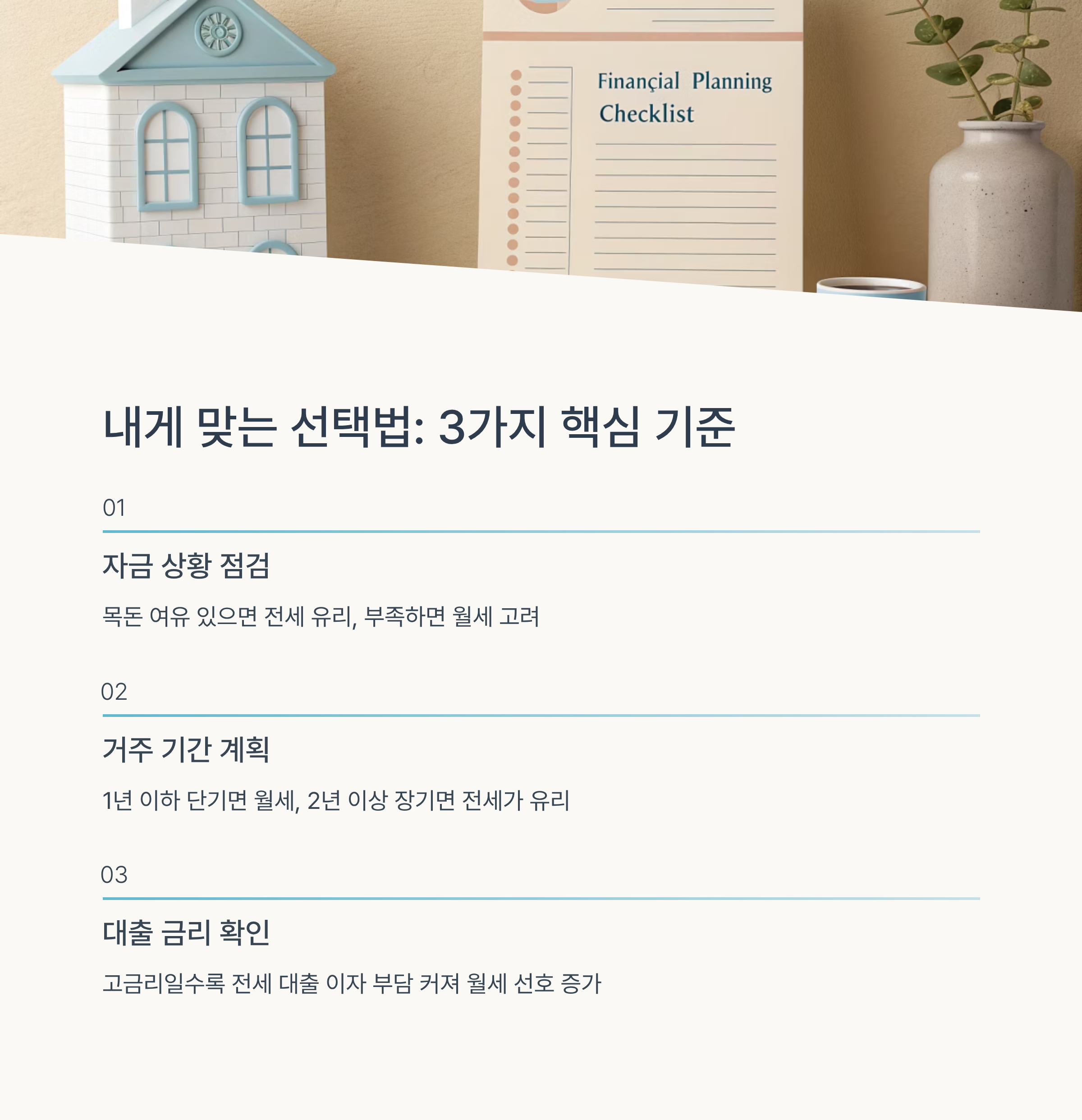 | 전세 선택 기준 | 여유 자금이 많고, 대출 이자율이 낮으며, 거주 기간이 2년 이상일 때 |