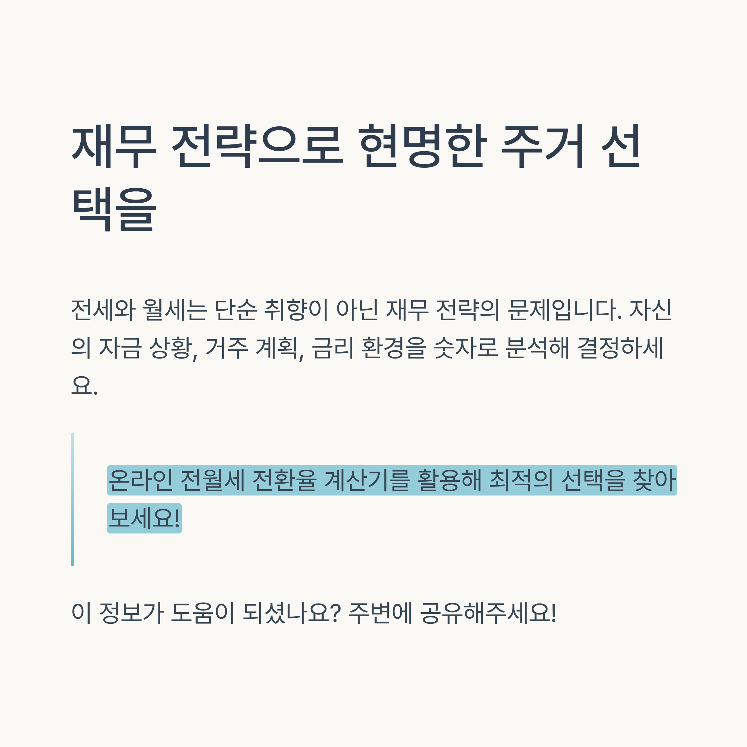 전세냐 월세냐의 선택은 더 이상 감정의 문제가 아닙니다. 금리, 대출, 수익률, 거주 기간 등 당신의 상황에 맞춘 숫자 기반 전략이 필요합니다. 자금 흐름이 곧 재테크의 시작입니다. 지금의 주거비 전략이 미래 자산에 어떤 영향을 주는지 계산하고 선택하세요.