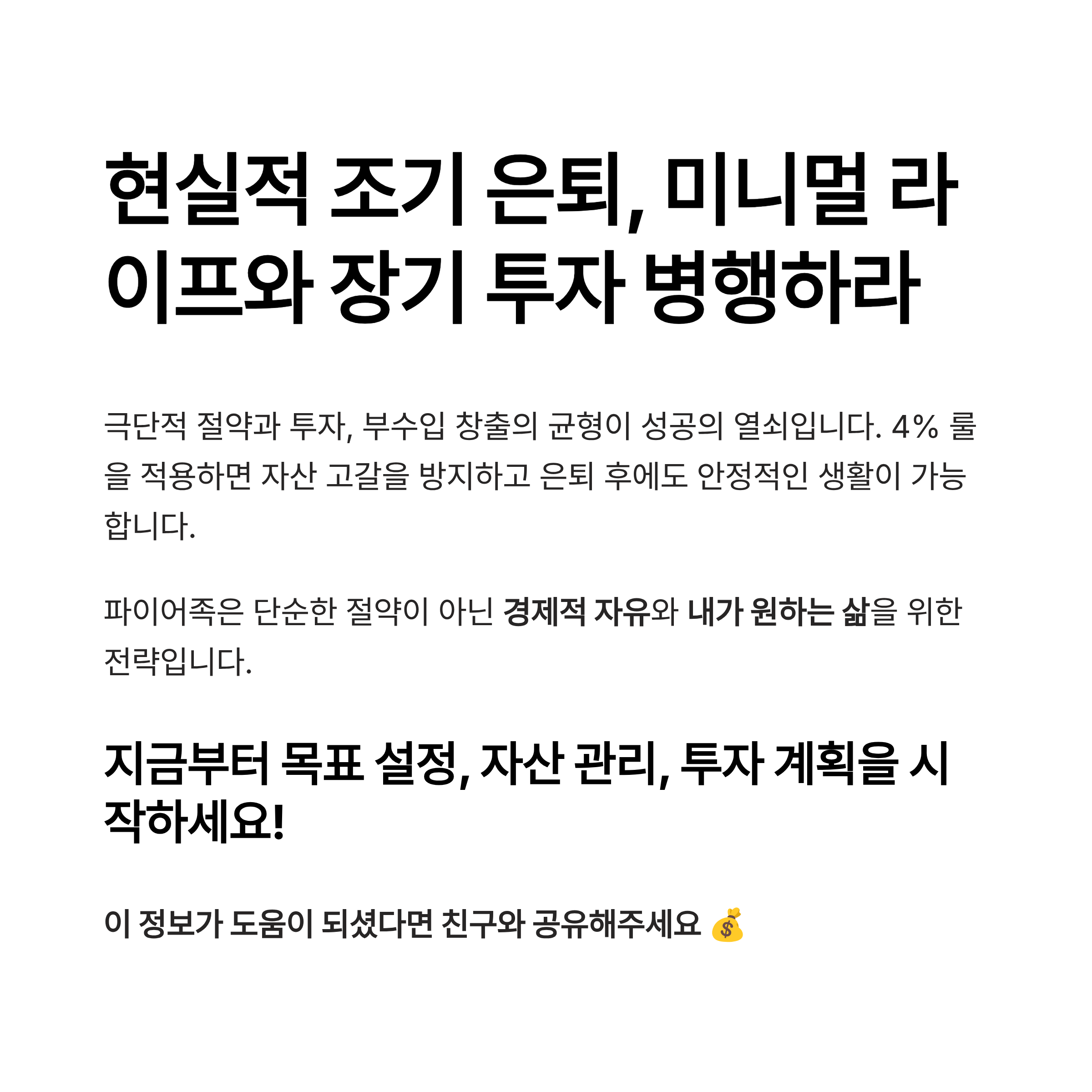 조기 은퇴를 위한 전략, 고민, 그리고 실천하고 있는 방법이 있다면 댓글로 공유해 주세요. 다양한 파이어족들의 경험이 서로에게 귀중한 인사이트가 될 수 있습니다.