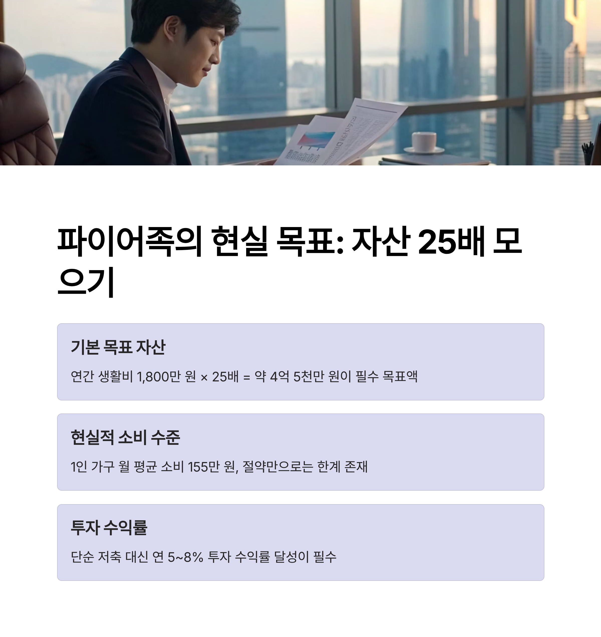 | 조기 은퇴 조건 | 자산 수익이 생활비를 초과할 수 있어야 실현 가능 |